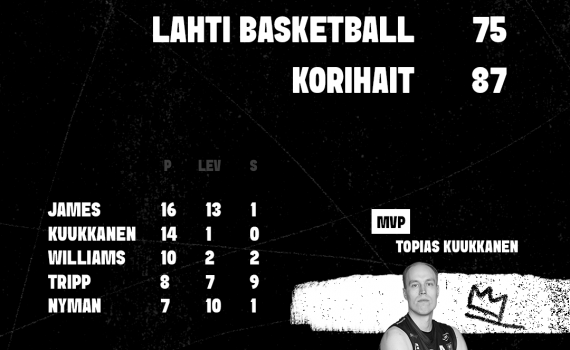 Lahti Basketball pettyi pahasti lauantaina Luhta Areenassa, kun hyvän alun jälkeen Korihait vei sarjapisteet lukemin 87-75 (39-46). Lauantain ottelu oli kuin Lahti Basketballin kausi pähkinänkuoressa. Ottelun sisällä taso vaihtelee hurjasti ja heikoilla hetkillä joukkueesta ei löydy johtajuutta kääntämään kelkkaa. Näin kävi myös lauantaina. Myös kotijoukkueen heittopeli oli luokatonta. Kolmosia lähti ilmaan 41 kappaletta onnistusmisprosentin ollessa…
