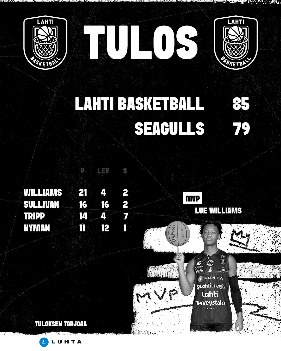 Ottelun parhaana Sporttiravintola Pelurin toimesta palkittiin 21 pistettä heittänyt Lue Williams. Avery Sullivan teki miehekkäät 16 pistettä ja otti 16:sta levypalloa. Corey Tripp tuskaili heittonsa kanssa, mutta upotti silti 14 pistettä. Vili Nyman onnistui 11:sta pisteen ja 12:sta levypallon verran. Topias Kuukkanen naulasi yhdeksän pistettä.