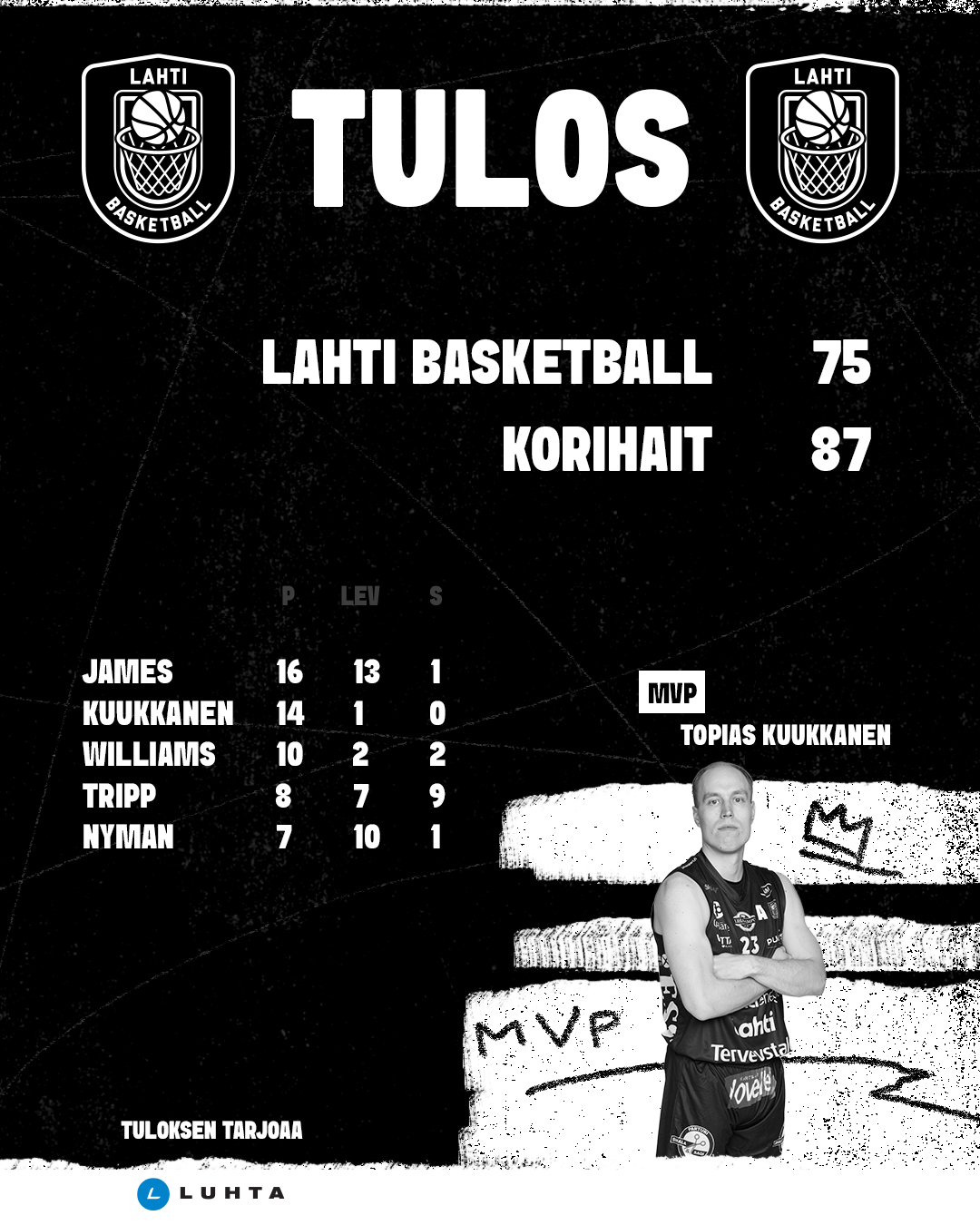 Lahti Basketball pettyi pahasti lauantaina Luhta Areenassa, kun hyvän alun jälkeen Korihait vei sarjapisteet lukemin 87-75 (39-46).