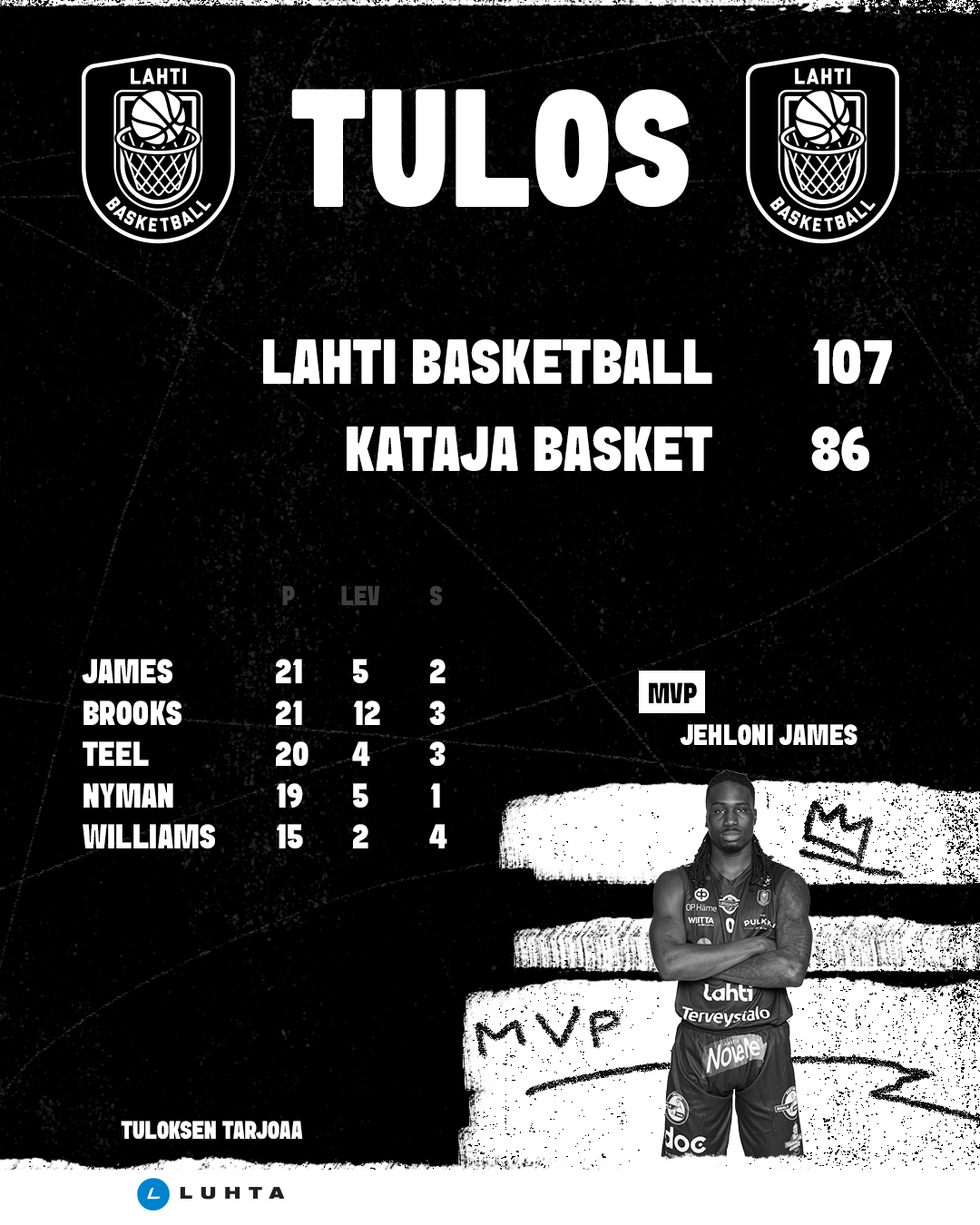 Kotijoukkueen Pelurin parhaana palkittiin 21 pistettä viimeistellyt Jehloni James. Palkinnon hänelle ojensi Jamesin äiti, joten hetki oli erityinen. Max Brooks jatkoi hurjia otteitaan ja takoi taululle miehekkäät tilastot: 21 pistettä, 12 levypalloa ja kuusi torjuntaa. Samage Teel teki 20 pistettä. Vili Nyman pelasi kauden parhaan pelinsä ja viimeisteli 19 pistettä. Lue Williams säesti 15 pisteellä.